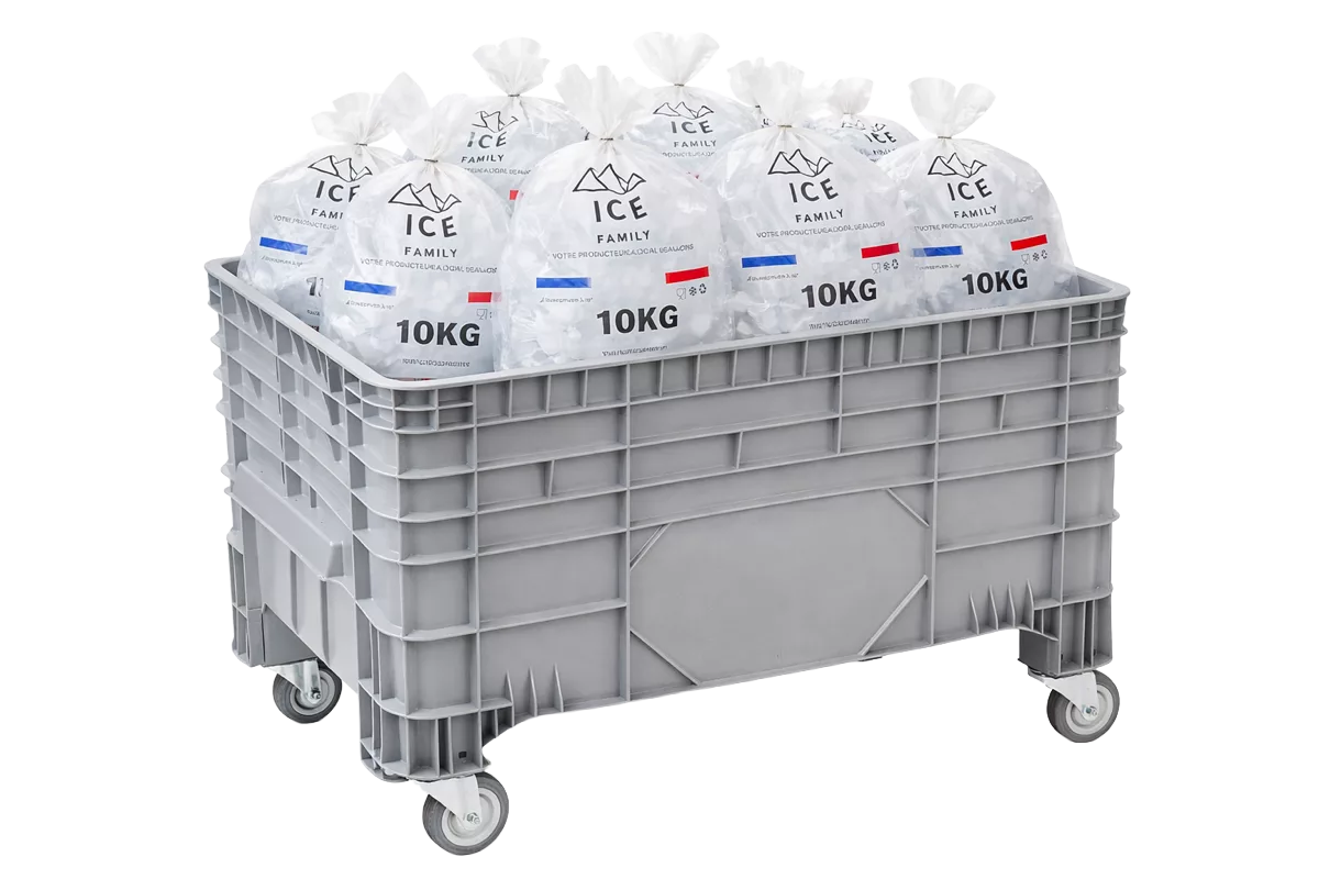 Des sacs de glaçons prêts à la vente, avec une logistique adaptée