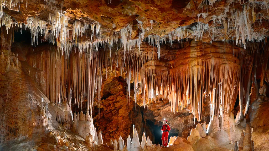 À trente minutes de Montpellier, dans les gorges de l’Hérault, la grotte de Clamouse est l’une des plus belles cavités souterraines de France. Elle abrite la plus grande concentration de cristaux d’aragonite d’Europe — des formations minérales d’une délicatesse et d’une rareté qui laissent sans voix.